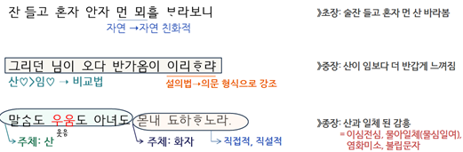| [현대어 해석] | 술잔을 들고 혼자 앉아서 먼 산을 바라보니 그리워하던 임이 온다고 한들 반가움이 이보다 더하겠는가? (산이) 말하거나 웃음을 짓지도 않지만, 나는 그를 몹시도 좋아하노라. |